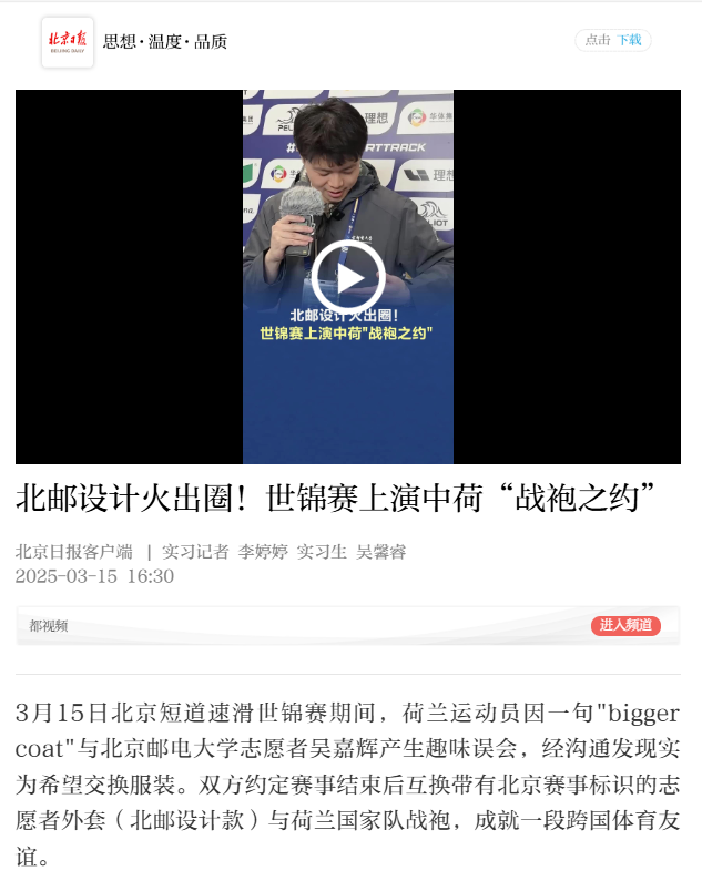 大賽期間,荷蘭運(yùn)動(dòng)員的一句"bigger coat"還與我校學(xué)生志愿者產(chǎn)生了一則趣味故事。經(jīng)溝通發(fā)現(xiàn),荷蘭運(yùn)動(dòng)員希望與我校志愿者交換北郵設(shè)計(jì)款志愿者服裝。