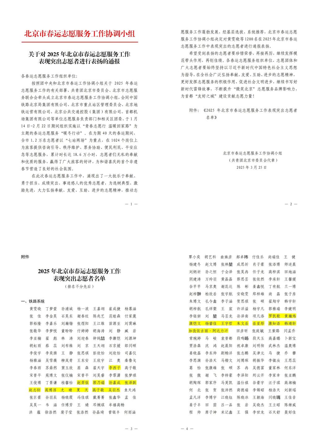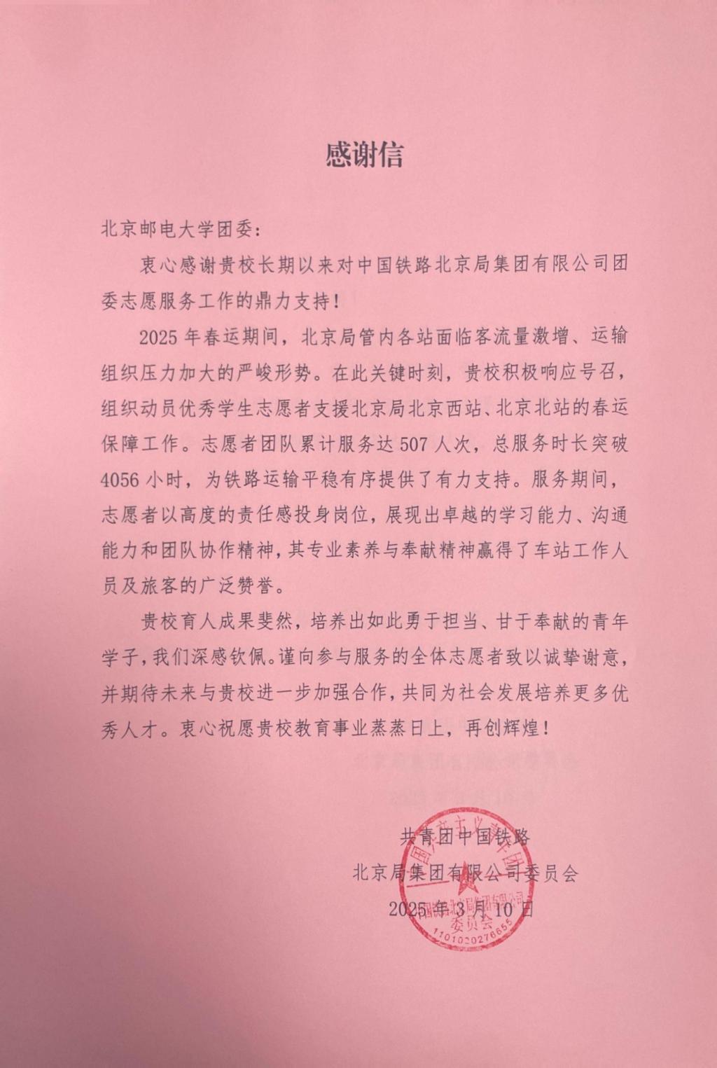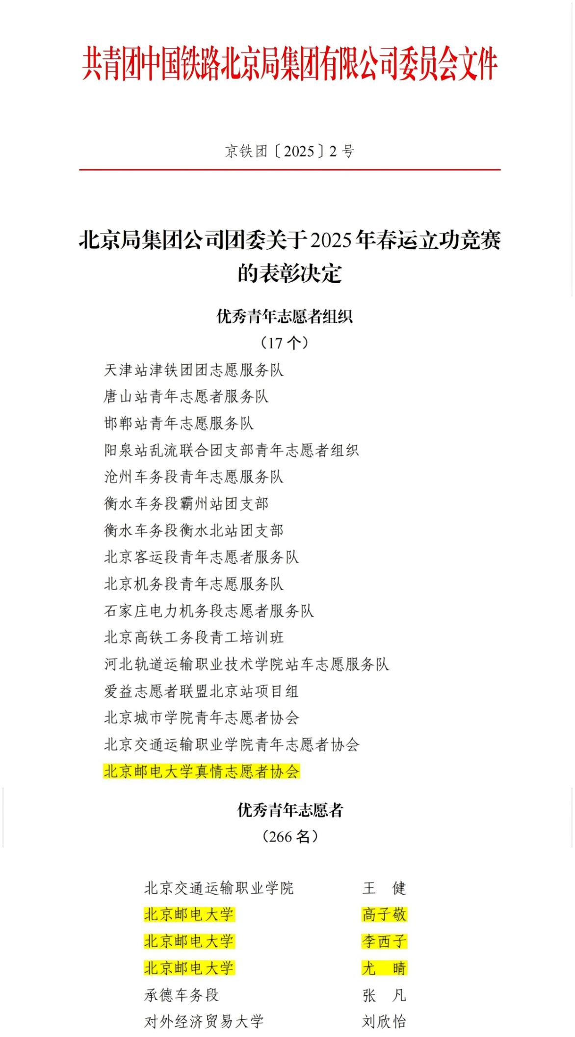經(jīng)共青團(tuán)中國鐵路北京局集團(tuán)有限公司委員會評定,“北京郵電大學(xué)真情志愿者協(xié)會”榮獲“優(yōu)秀青年志愿者組織”稱號,我校志愿者高子敬、李西子、尤晴3名學(xué)生榮獲“優(yōu)秀青年志愿者”稱號;經(jīng)北京市春運(yùn)志愿服務(wù)工作協(xié)調(diào)小組綜合評定,我校趙羿弦、孫嘉成等21名學(xué)生(名單附后)榮獲“2025年北京市春運(yùn)志愿服務(wù)工作表現(xiàn)突出志愿者”稱號。